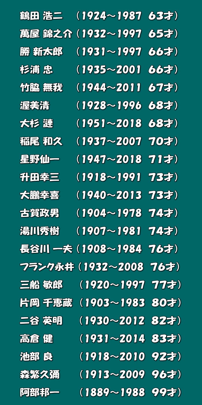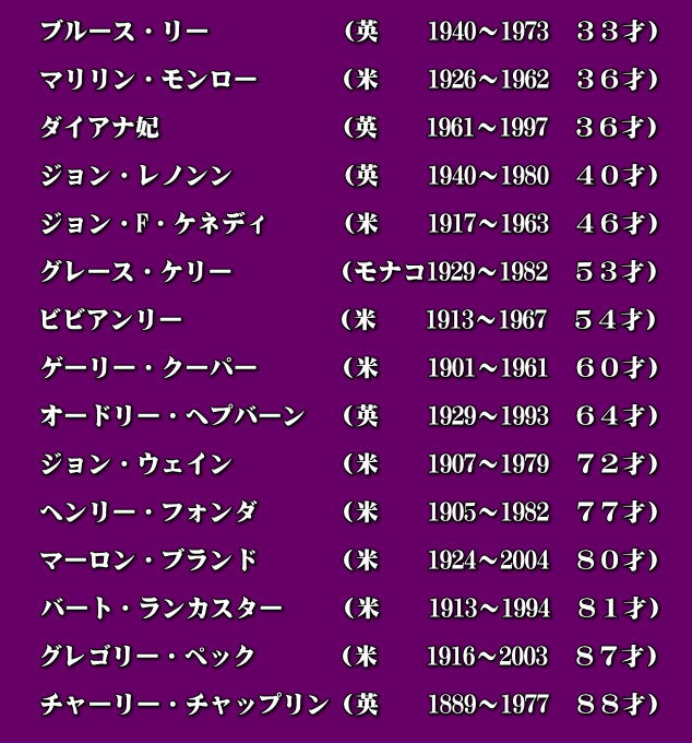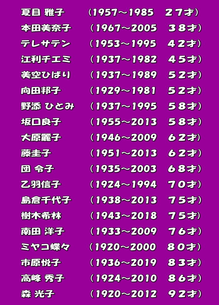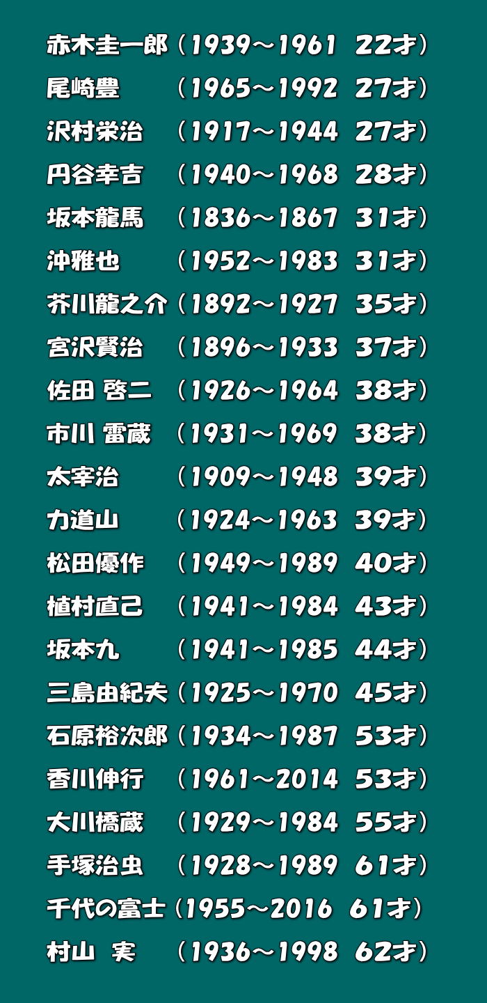 俳優・歌手・スポーツ選手・作家・実業家・政治家  全国に名を轟かせている方々 ほんとに早く逝きました。