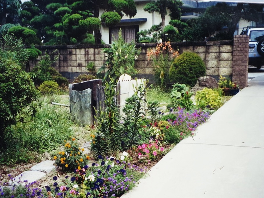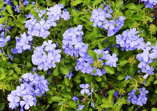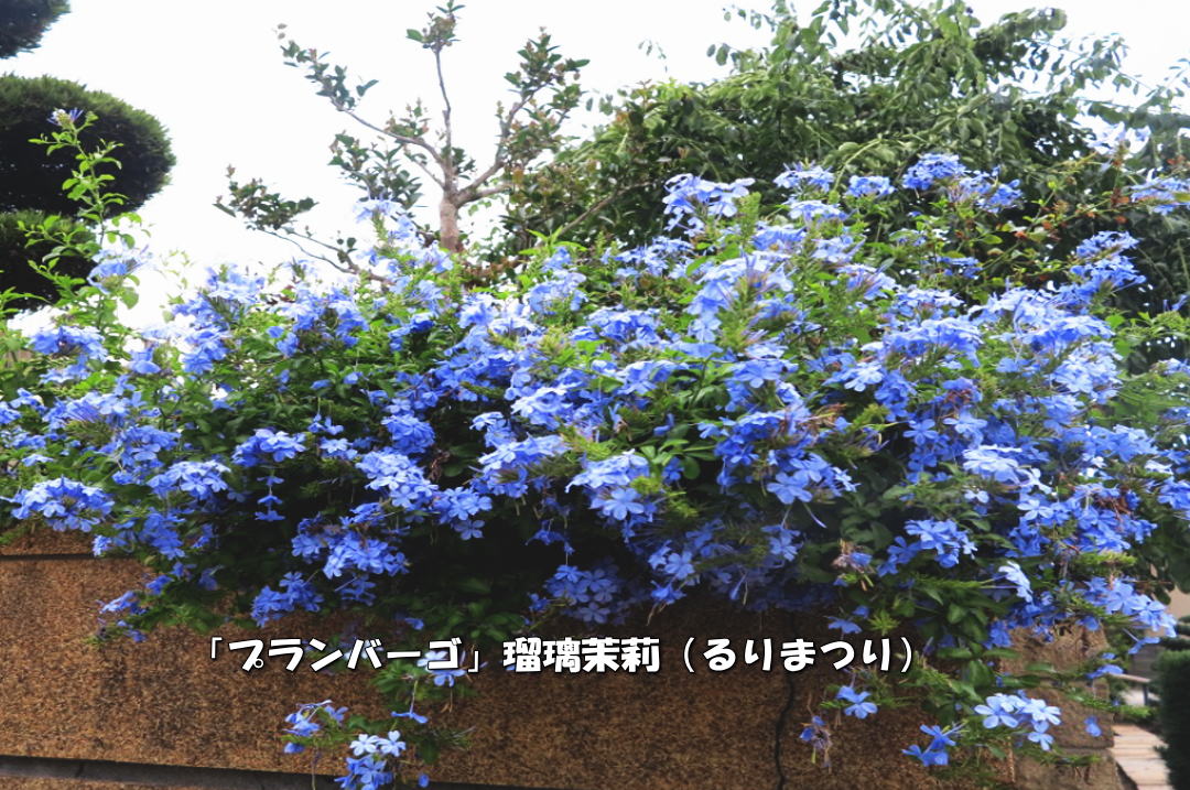 西の垣根に プルンパーゴ別名(瑠莉祭り)を植える。 6〜11月まで咲くが 冬には 寒さに弱いのでビニールかけする。