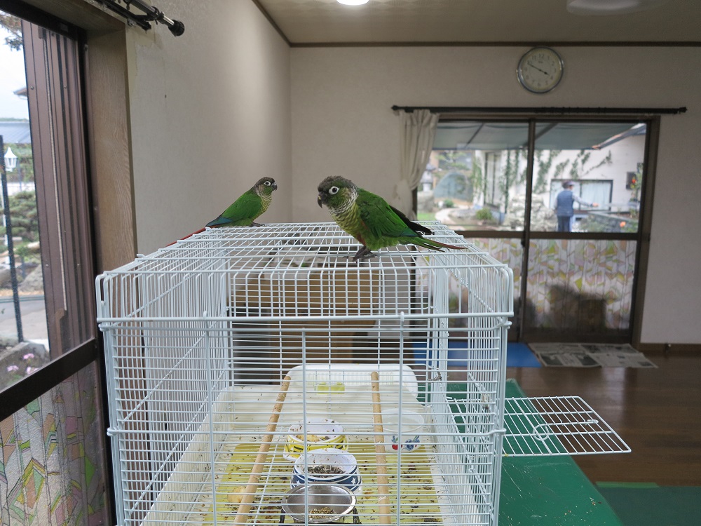 2019年 10/16 ホウミドリウロコインコ何処からか来た。               可愛いので カゴを買って飼っていたが   2020年 3月 に不注意で亡くしてしまった。そこで 4/7 インコを2羽買う