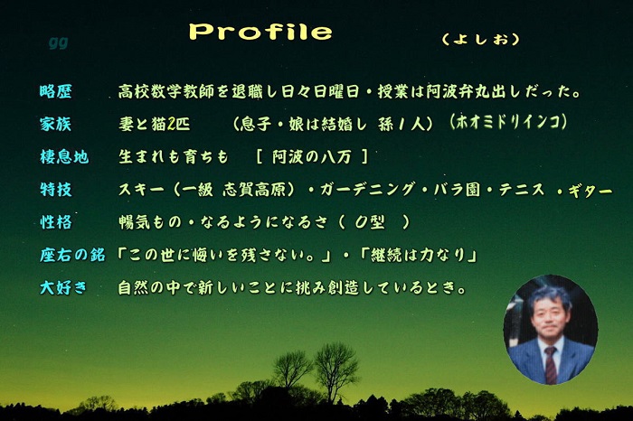 1975年4月1日 教員移動で小松島高校から徳島市立高校に移動があった 斎藤 勲、坂野栄一、羽山久男、川人昭夫、三木庄吉 が 眉山の麓 桜満開の下で 歌え踊れの宴会が始まった。盃には 桜の花びらが浮かび 遅くまで酔いしれた。 このとき 斎藤 勲さんが 「記念として 剣山次郎丑の油絵を描いてやろう。」 そして 数か月後に 素晴らしい 上の絵を描いてくださった。・・・・・・・ その後 40年以上になるが 俺の最も大切な宝物として 応接間に掲げ 大切にして 当時を懐かしく想い出していますよ 本当に有難う。